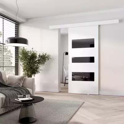 Interiérové dvere na stenu BARRET 3 zaisťujú súkromie bez časovo náročnej inštalácie. Dvere je možné využiť na oddelenie 2 miestností alebo ako dvere do skrine či šatne. Dvere zdobia dekoratívne prvky z čierneho skla.