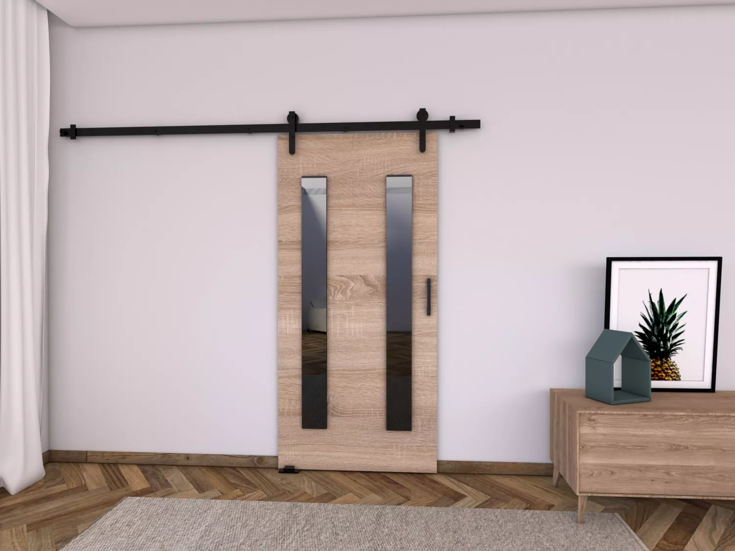 Posuvné dvere v loftovom štýle BUSHLAND 8 zaisťujú súkromie bez časovo náročnej inštalácie. Dvere zdobia lepené dekoratívne prvky z čierneho skla. Použitý posuvný systém zaručuje tichý chod a bezporuchovú prevádzku po mnoho rokov.