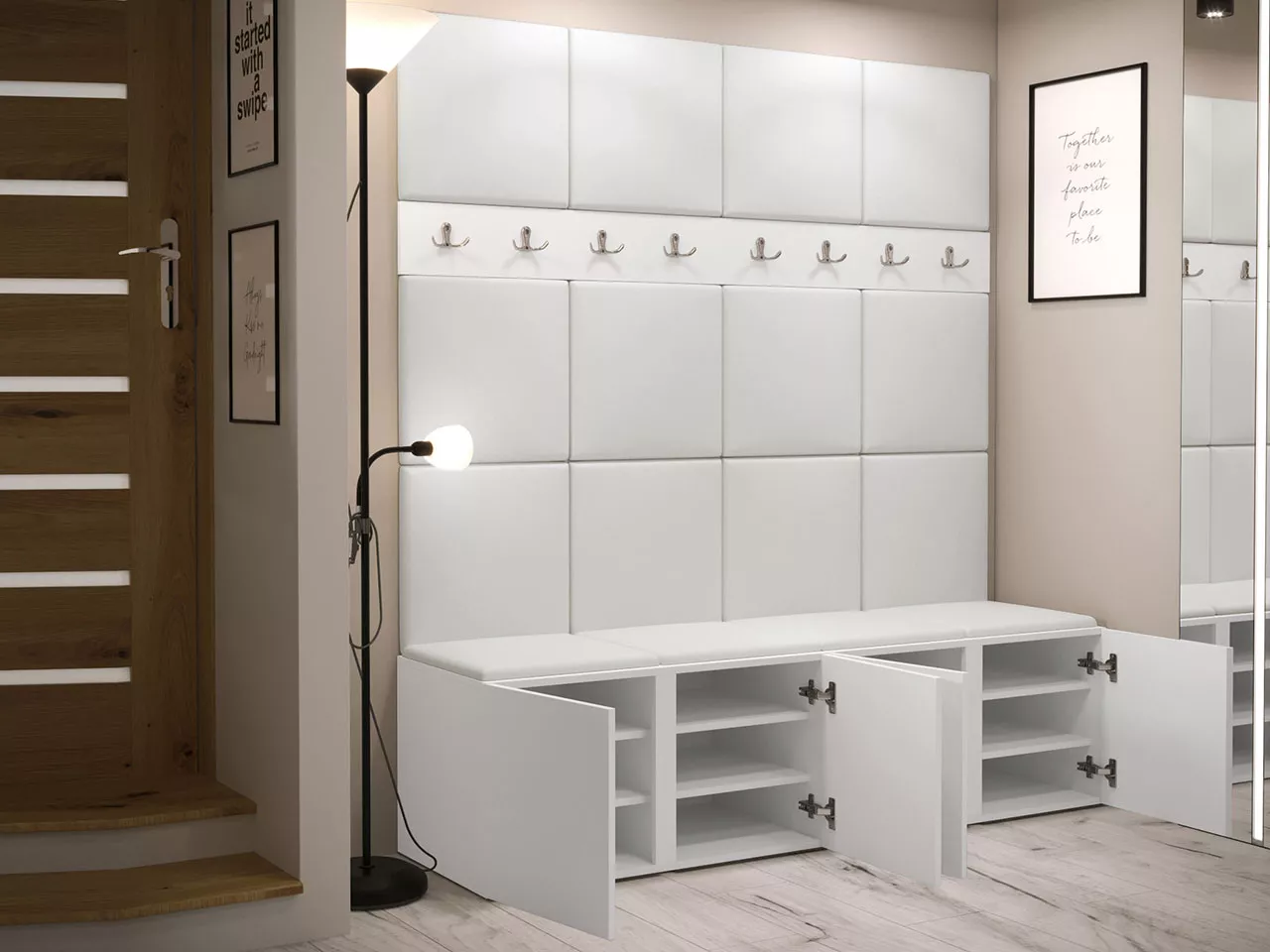 Moderná stena do predsiene SELAND 6 zútulní váš vstupný priestor. Stena sa skladá zo sedacieho botníku a praktického nástenného panelu s 8 vešiakmi. Čalúnené panely umiestnené na botníku prinášajú zvýšený komfort pri sedení, panely umiestnené na stene majú dekoratívnu funkciu, sú zvukotesné a chránia stenu pred znečistením.