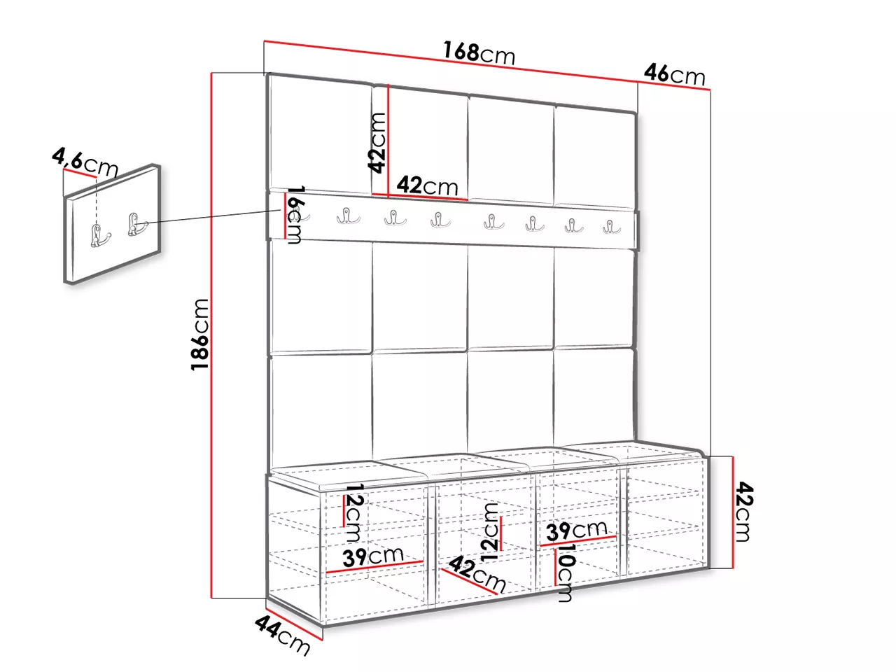 - 2x nástenný vešiak: 84/16/4,6 cm