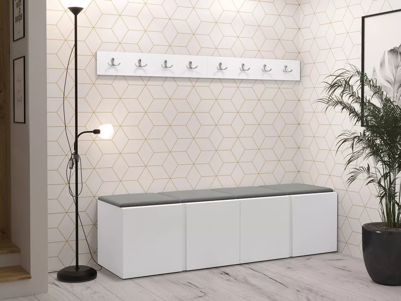 Nábytok do chodby s čalúnenými panelmi 42x42 SELAND 8 - biely / tmavo šedý