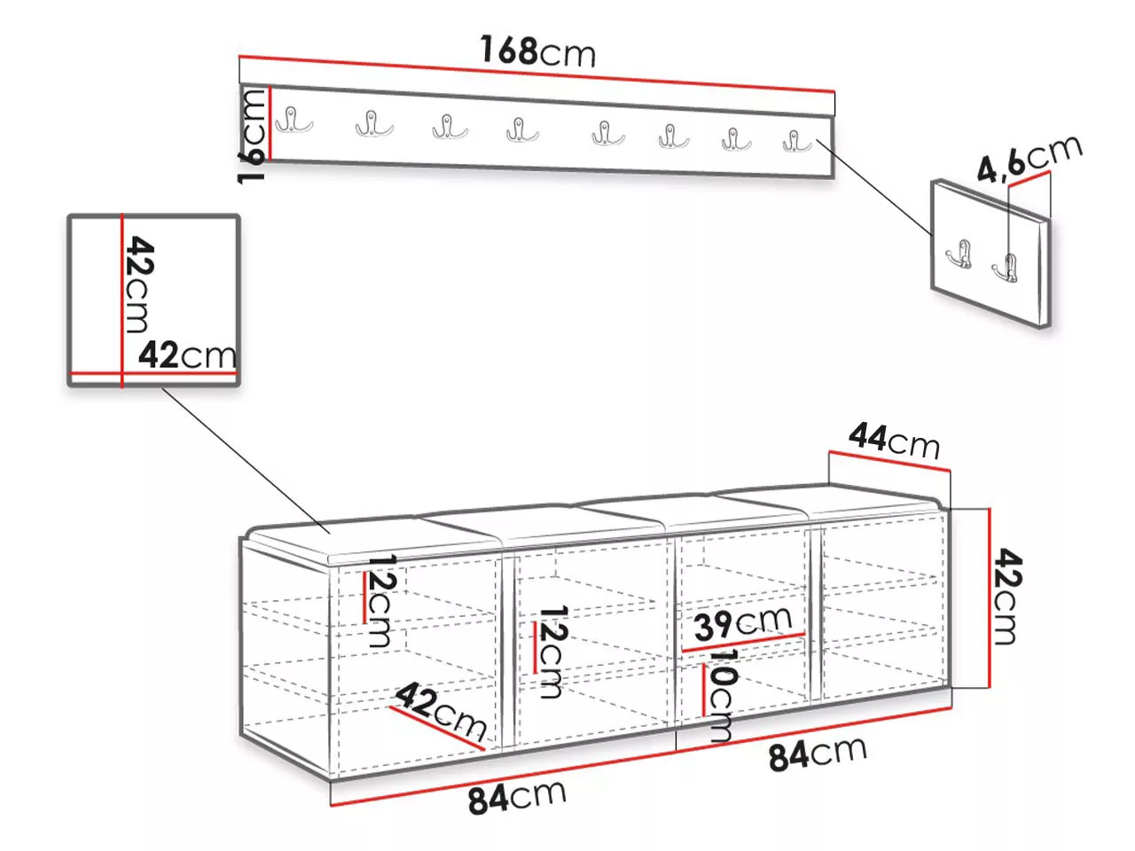 - 2x nástenný vešiak: 84/16/4,6 cm