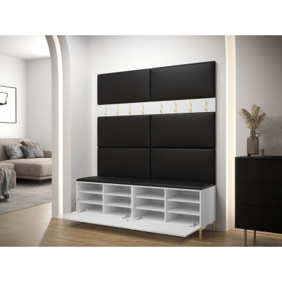 Elegantná stena do predsiene ANDORA 2 zútulní vstupný priestor. Stenu tvoria praktické sedacie botníky a nástenné panely s vešiakmi. Súčasťou steny sú dekoratívne čalúnené panely, ktoré chránia stenu pred znečistením.