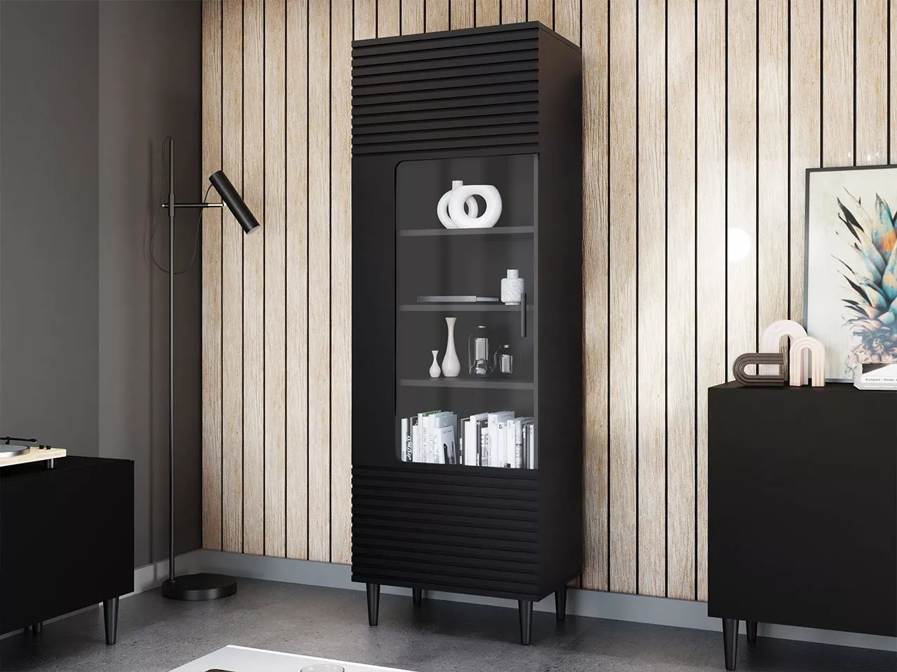 Úzka vitrína QUINLAN zaujme svojim fenomenálnym dizajnom. Vitrína s frézovanými čelami, presklenými dvierkami a vysokými nohami skvele zapadne do moderných aj škandinávskych interiérov. Rad 6 hlbokých políc vám umožní uschovať aj vystaviť najrôznejšie predmety.