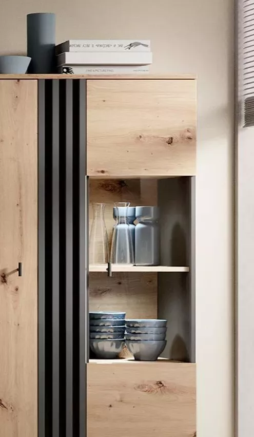 Vitrína CHATOM v obľúbenej kombinácii prírodného duba a kontrastnej antracitovej farby vnáša do obývačky súčasný štýl s prírodným nádychom. Decentné lamely podčiarkujú moderný dizajn a zvýrazňujú čisté línie nábytku. Na mieru navrhnuté zvislé úchytky a čierne kovové nôžky zaisťujú vzdušný vzhľad. Vnútorné police je možné doplniť LED osvetlením pre ešte výraznejší efekt.