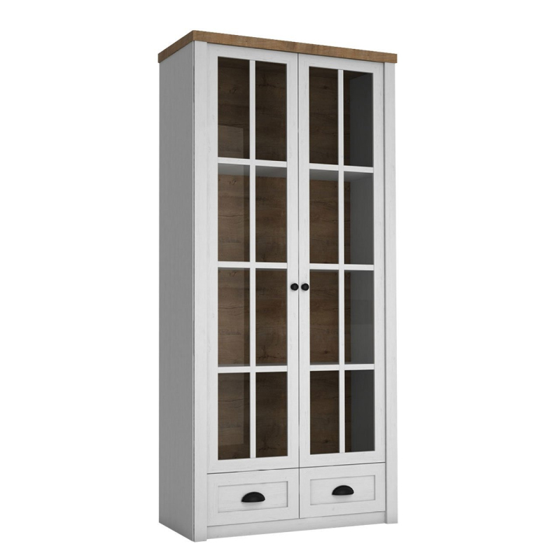 Široká vitrína ALZEY skvele zapadne do klasického, provensálskeho aj škandinávskeho interiéru. Za presklenými dvierkami sa ukrýva mnoho priestranných políc a nechýbajú ani 2 zásuvky umiestnené v spodnej časti vitríny. Presklená časť je navyše vybavená bielym LED osvetlením.