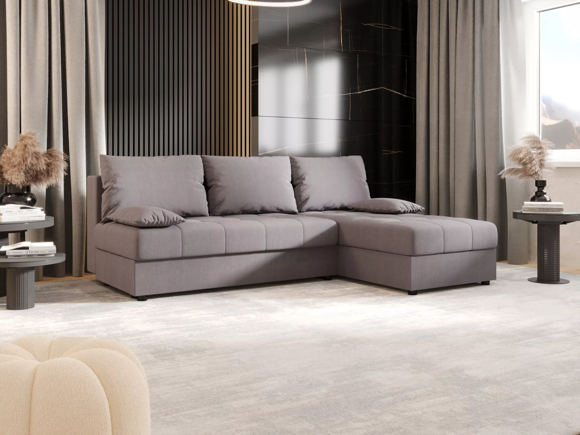 Rozkladacia rohová sedačka ADELINDE má operadlo tvorené voľne loženými vankúšmi, čo zvýši komfort používania a spríjemní každodenné chvíle odpočinku. Disponuje rozkladacou funkciou na lôžko s rozmermi 130x200 cm a nechýba ani praktický úložný priestor na uloženie sezónneho oblečenia alebo lôžkovín.