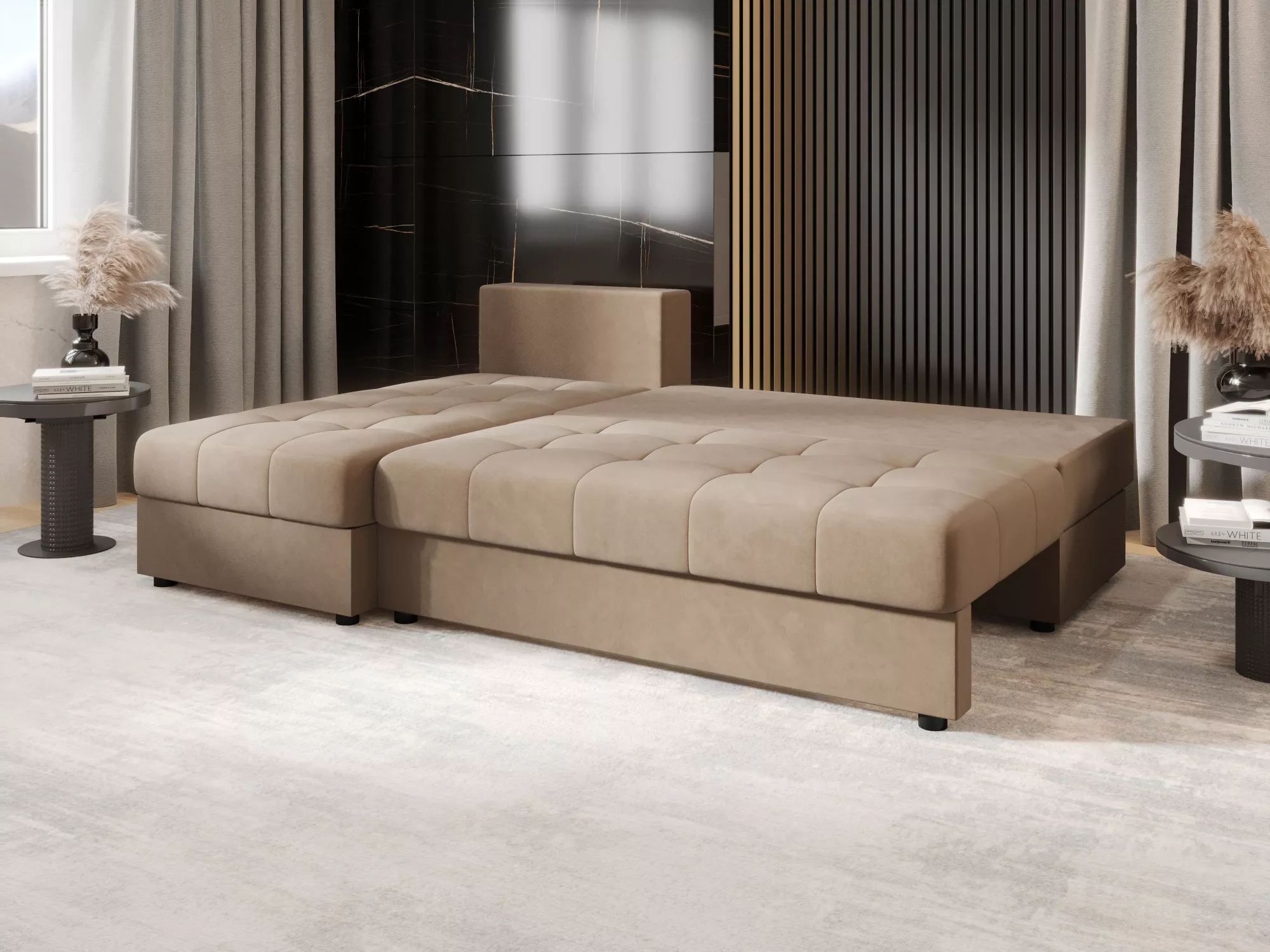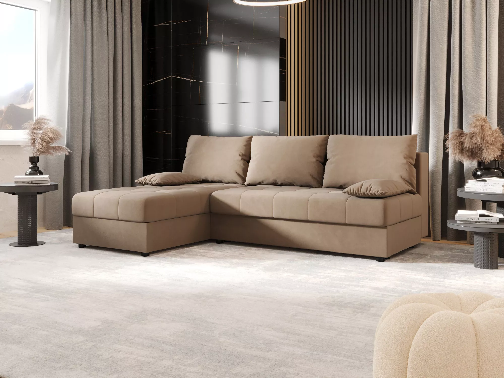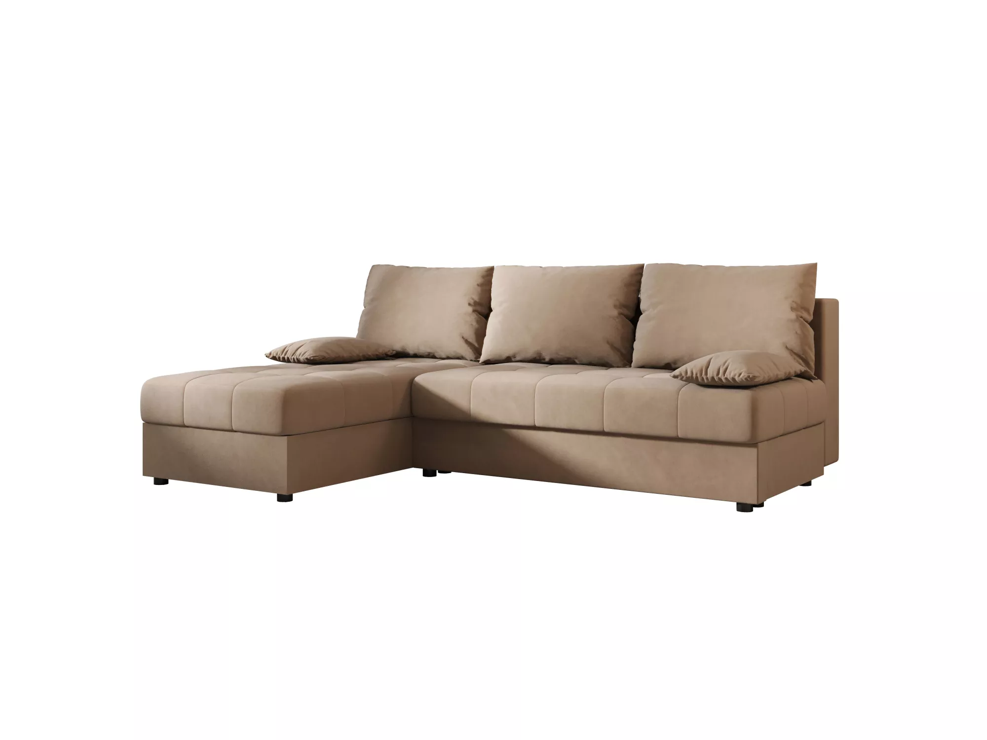 Rozkladacia rohová sedačka ADELINDE má operadlo tvorené voľne loženými vankúšmi, čo zvýši komfort používania a spríjemní každodenné chvíle odpočinku. Disponuje rozkladacou funkciou na lôžko s rozmermi 130x200 cm a nechýba ani praktický úložný priestor na uloženie sezónneho oblečenia alebo lôžkovín.