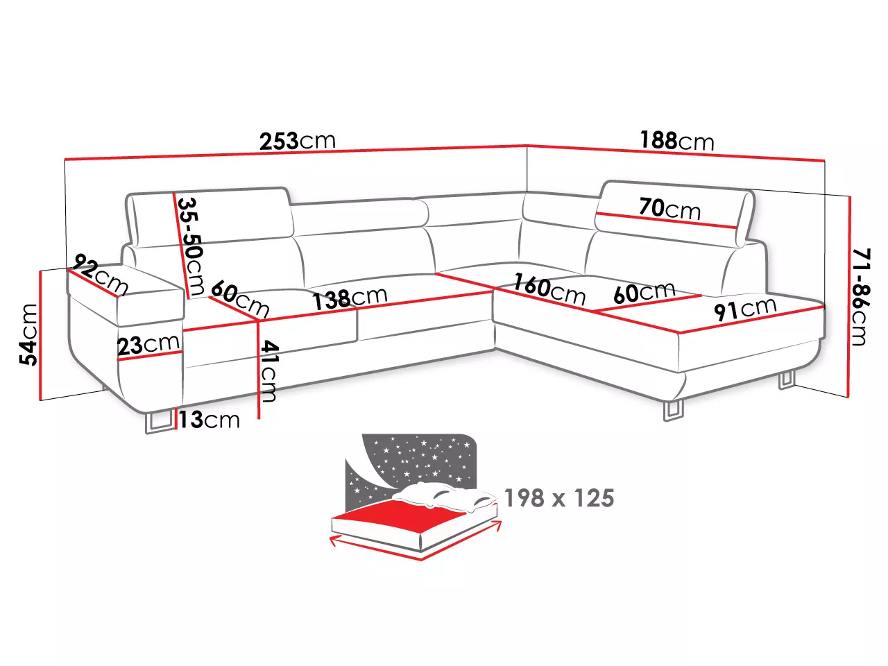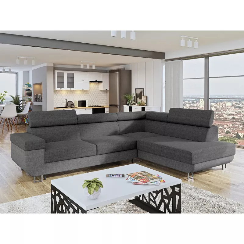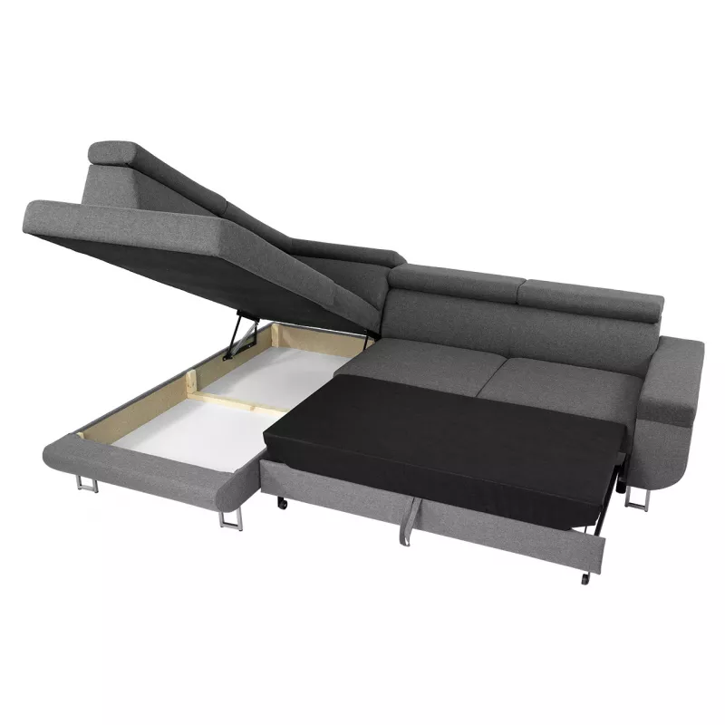 Rohová sedacia súprava zaujme svojou funkčnosťou. Bola skonštruovaná ako písmeno L, čo znamená, že má dostatok priestoru na sedenie pre hostí a sledovanie televízie v ľahu. Sedačka disponuje nastaviteľnými opierkami hlavy. Jednoduchým rozložením získate spaciu plochu o rozmeroch 128 x 195 cm. Zadná časť rohu je čalúnená látkou, čo umožňuje jej umiestnenie kdekoľvek v miestnosti. V sedacej súprave je umiestnený praktický úložný priestor na ložnú bielizeň, ktorý môže slúžiť taktiež ako miesto pre sezónne oblečenie.