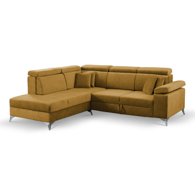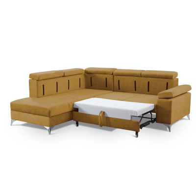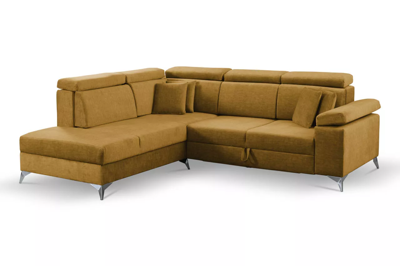 Rozkladacia rohová sedacia súprava RAIWIN je funkčná a moderná. Je vybavená rozkladacím mechanizmom typu delfín a úložným priestorom na lôžkoviny. Operadlá z peny sú pripevnené suchým zipsom. Nastaviteľné opierky hlavy vám potom umožnia zaujať pohodlnú polohu pri odpočinku. Celok podčiarkujú vysoké kovové nohy.