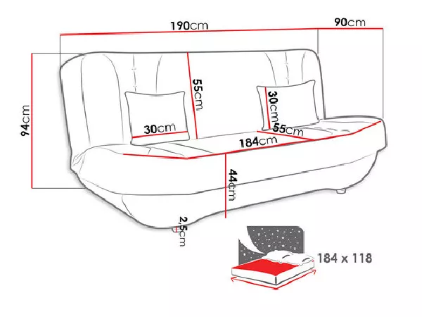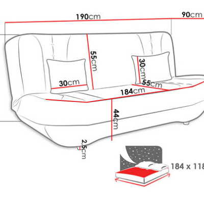 Rozkladacia pohovka SACRAMENTO zaujme svojou eleganciou a skvele zapadne do moderného interiéru. Pohovka je zdobená pruhmi a poteší vás aj 2 vankúše. Ich rozmer je 30 x 30 cm. Vankúše majú zips, ktorý umožňuje ich pranie. Pohovku je možné rozložiť na komfortné lôžko so spacím priestorom 118 x 184 cm. V pohovke sa nachádza praktický úložný priestor na posteľnú bielizeň, ktorý môže slúžiť aj ako miesto pre sezónne oblečenie. Zadná časť je čalúnená látkou, čo umožňuje jej umiestnenie kdekoľvek v miestnosti.
