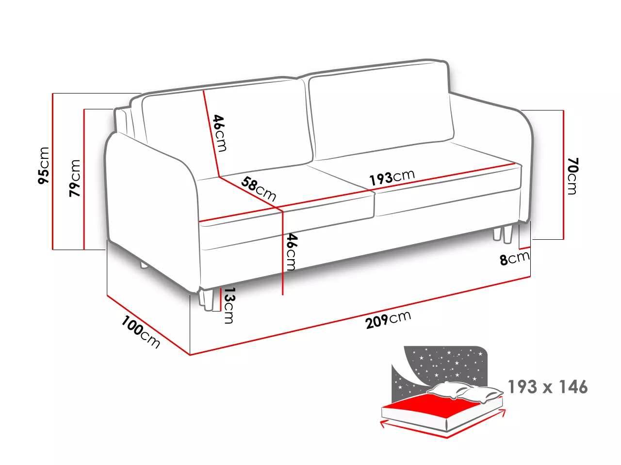 Trojmiestna rozkladacia pohovka PINARA zaujme svojou eleganciou a skvele zapadne do moderného interiéru. Plyšová tkanina použitá v procese výroby zabezpečuje dokonalý vzhľad a trvanlivosť. Navyše pohovku je možné rozložiť na lôžko s plochou na spanie 146 x 193 cm. V pohovke sa nachádza praktický úložný priestor na posteľnú bielizeň, ktorý môže slúžiť tiež ako miesto na sezónne oblečenie. Zadná časť pohovky je čalúnená látkou, čo umožňuje jej umiestnenie kdekoľvek v miestnosti.