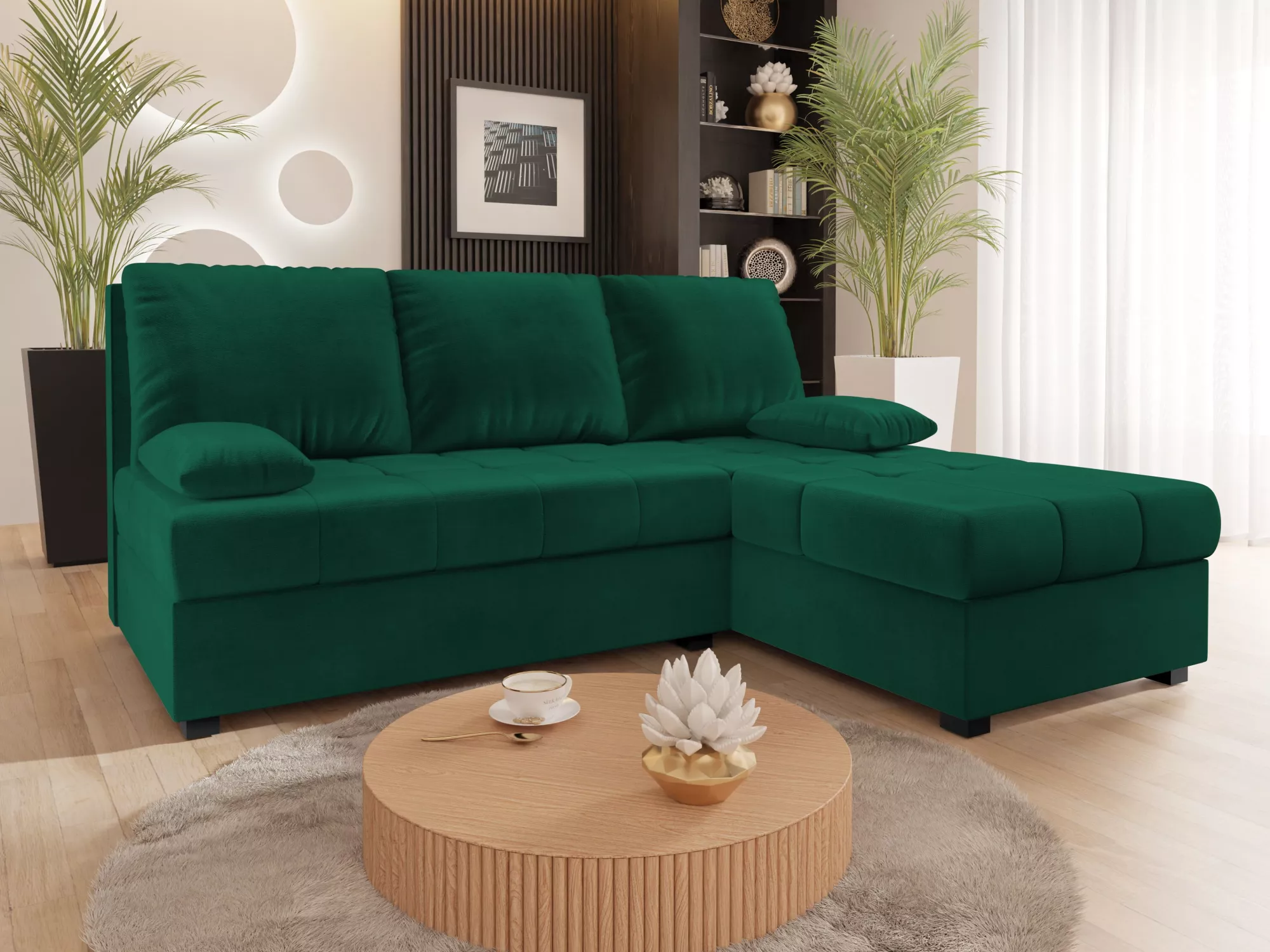 Rozkladacia rohová sedačka NARCIA sa vyznačuje moderným dizajnom s hlbokým prešívaním a vysokým komfortom. Mäkké oporné vankúše ponúknu oporu pre dlhé večery pri filme alebo príjemné chvíle s rodinou.
