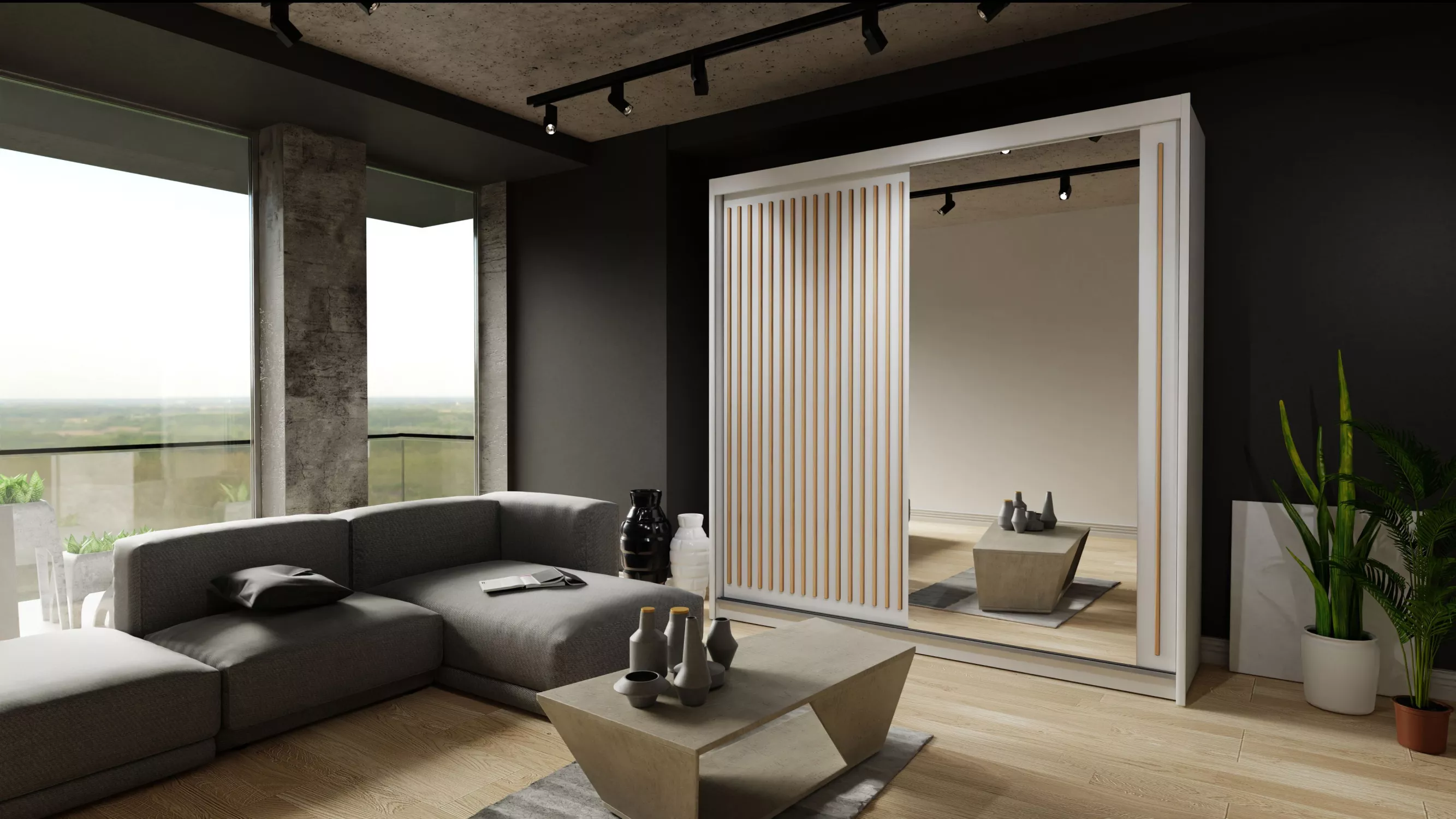 Šatníková skriňa so zrkadlom KAREN sa vyznačuje veľkou kapacitou a funkčnosťou. Zaujme predovšetkým modernými lamelami a veľkým zrkadlom. Súčasťou skrine je 6 políc a 4 šatníkové tyče.