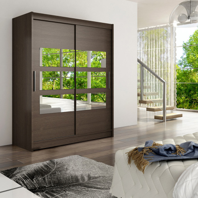 Priestranná šatníková skriňa o šírke 150 cm bude svojím moderným vzhľadom zaujímavým prvkom v miestnosti a vďaka posuvným dverám vyrieši prípadný nedostatok miesta. Vnútorné usporiadanie skrine ponúka dostatok políc na uskladnenie osobných vecí a šatníkovú tyč na zavesenie ramienok. Zrkadlo na dverách je elegantným aj pratickým prvkom