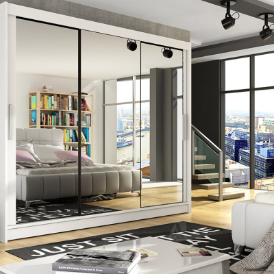 Priestranná šatníková skriňa o šírke 250 cm bude svojim moderným vzhľadom zaujímavým prvkom v miestnosti a vďaka posuvným dverám vyrieši prípadný nedostatok miesta. Vnútorné usporiadanie skrine ponúka dostatok políc na uskladnenie osobných vecí a šatníkovú tyč na zavesenie ramienok. Veľké zrkadlo sa iste stane každodenným praktickým pomocníkom