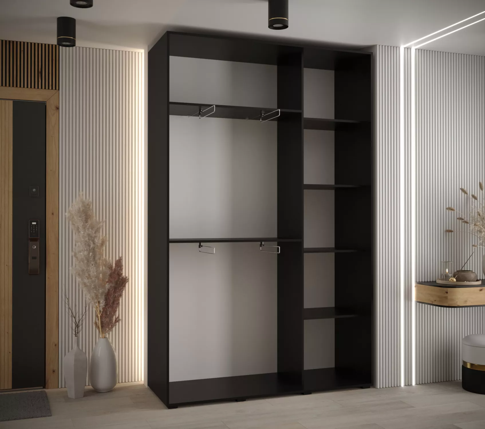 Šatníková skriňa ASIRI zaujme svojim moderným dizajnom a praktickými prvkami. Šatníková skriňa má posuvné dvere, ktoré sa neotvárajú do priestoru a ušetria tak veľa miesta.