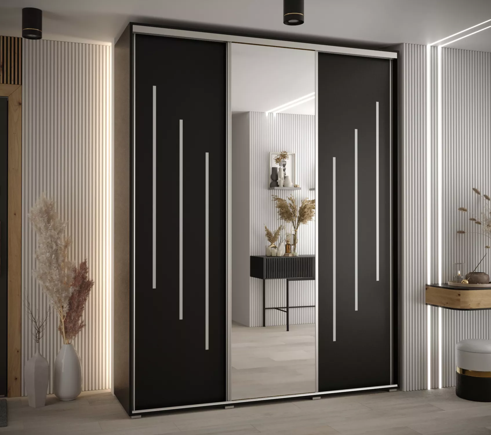 Šatníková skriňa ASIRI zaujme svojim moderným dizajnom a praktickými prvkami. Šatníková skriňa má posuvné dvere, ktoré sa neotvárajú do priestoru a ušetria tak veľa miesta.