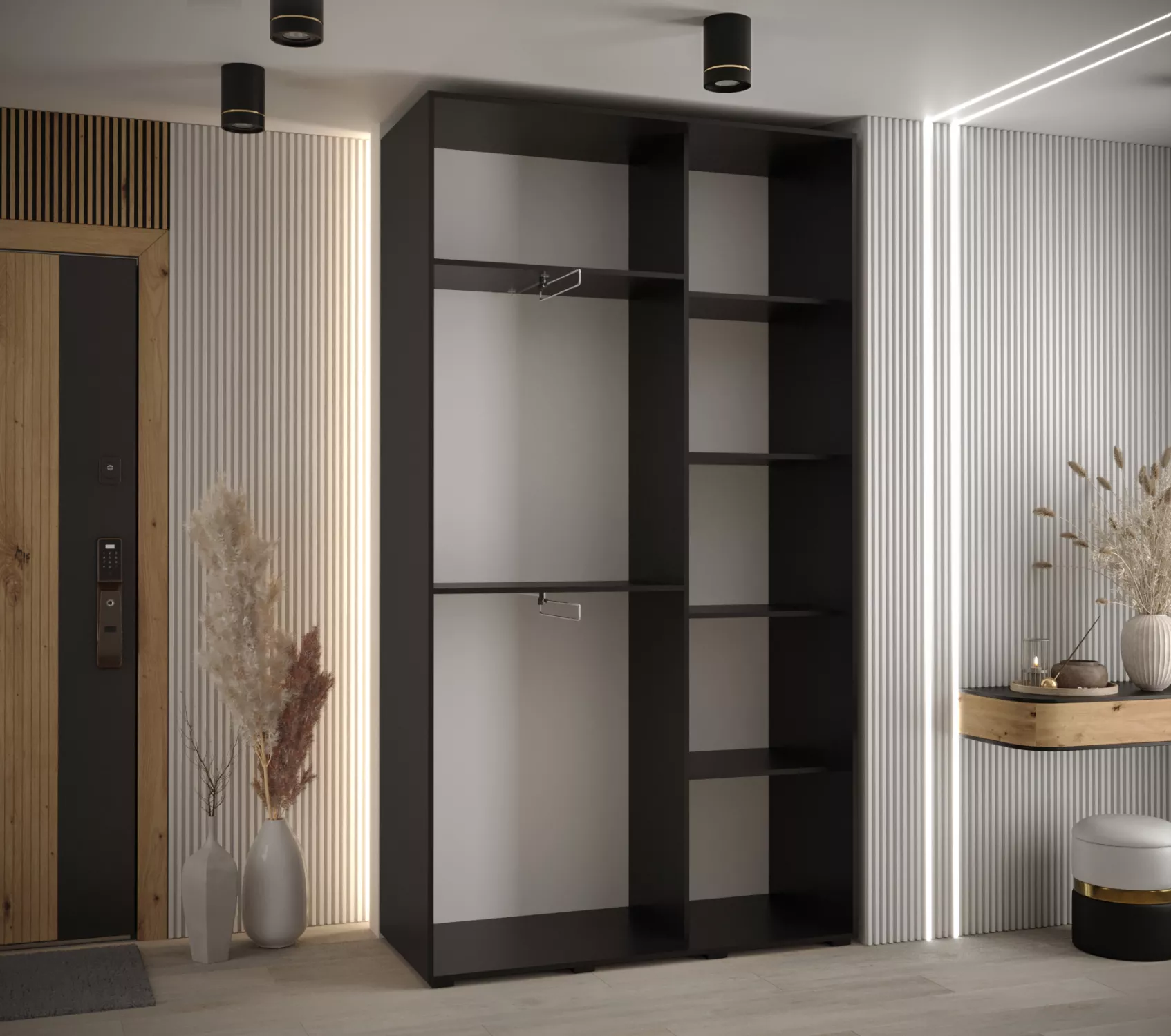 Šatníková skriňa ASIRI zaujme svojim moderným dizajnom a praktickými prvkami. Šatníková skriňa má posuvné dvere, ktoré sa neotvárajú do priestoru a ušetria tak veľa miesta.