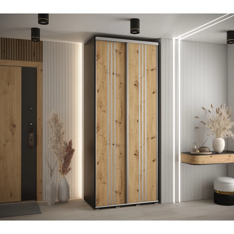 Šatníková skriňa ASIRI 6 - 100/60 cm, čierna / dub artisan / strieborná