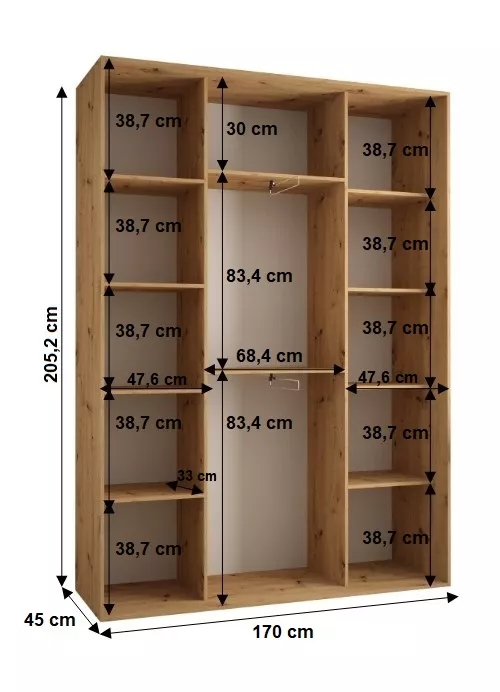 Súčasťou skrine sú police aj 2 výsuvné šatníkové tyče. Šuplíky do skrine nájdete v sekcii Odporúčame prikúpiť.