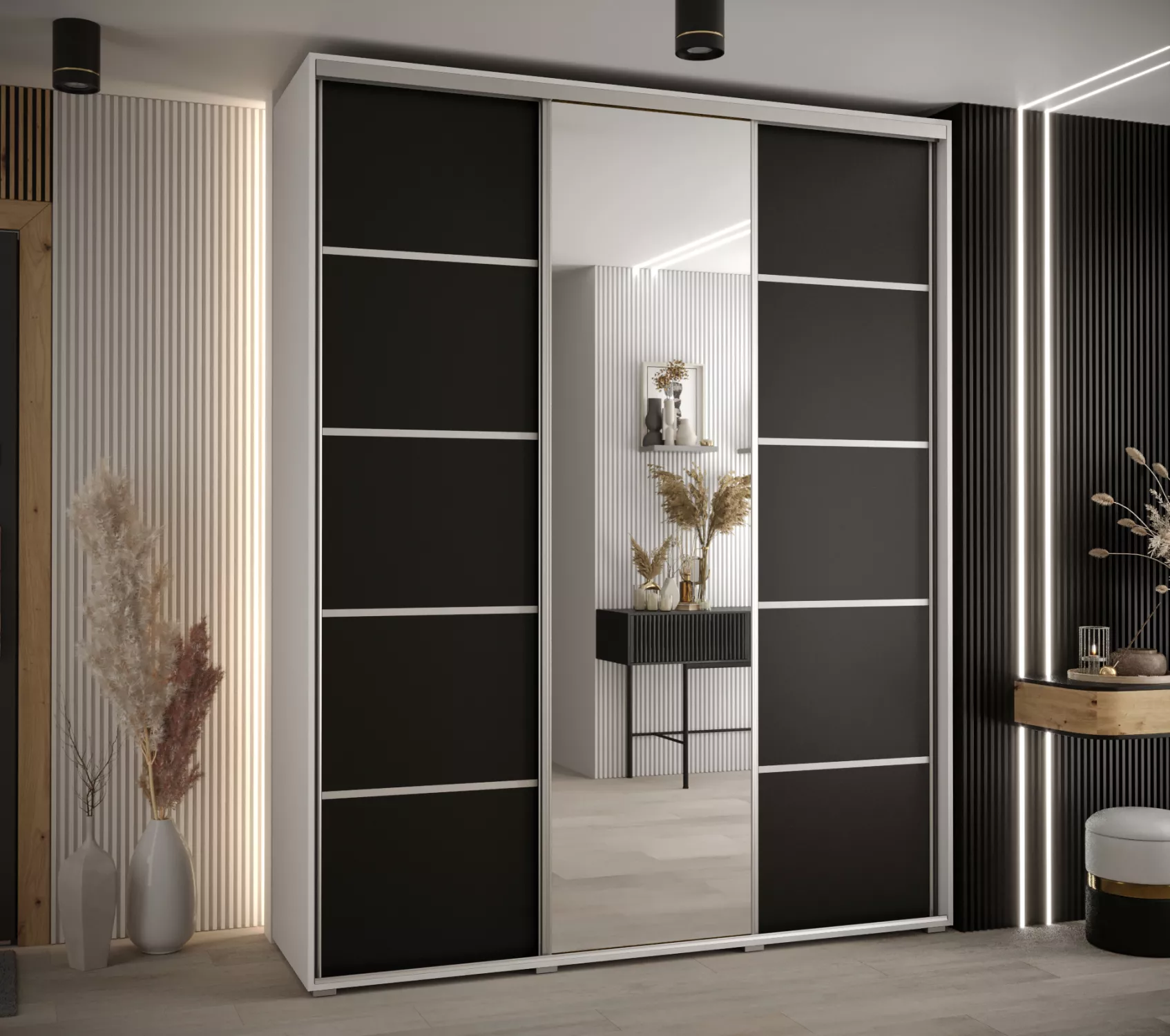 Šatníková skriňa YVONA upúta pozornosť každého, kto hľadá funkčné a štýlové riešenie do svojej spálne. Skriňa je vybavená posuvnými dverami pre ľahšiu manipuláciu.