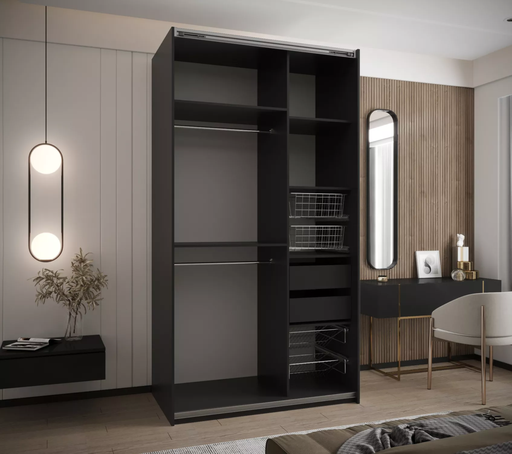 Prídavné police do skrine, šuplíky, drôtený košík a košík na topánky nájdete na dokúpenie v sekcii Odporúčame prikúpiť. Do skrine je možné nainštalovať 1 alebo 2 police a maximálne 4 sety šuplíkov.