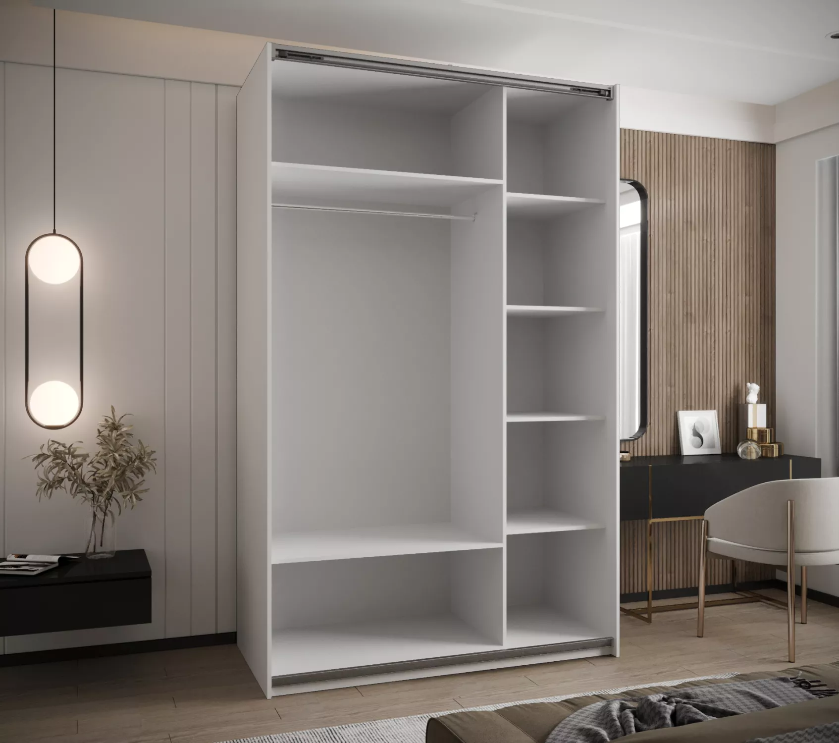 Šatníková skriňa SAMARA 2 – 150 predstavuje spojenie elegancie a funkčnosti. Ponúka dostatok úložného priestoru v podobe policového systému a 2 šatníkových tyčí.