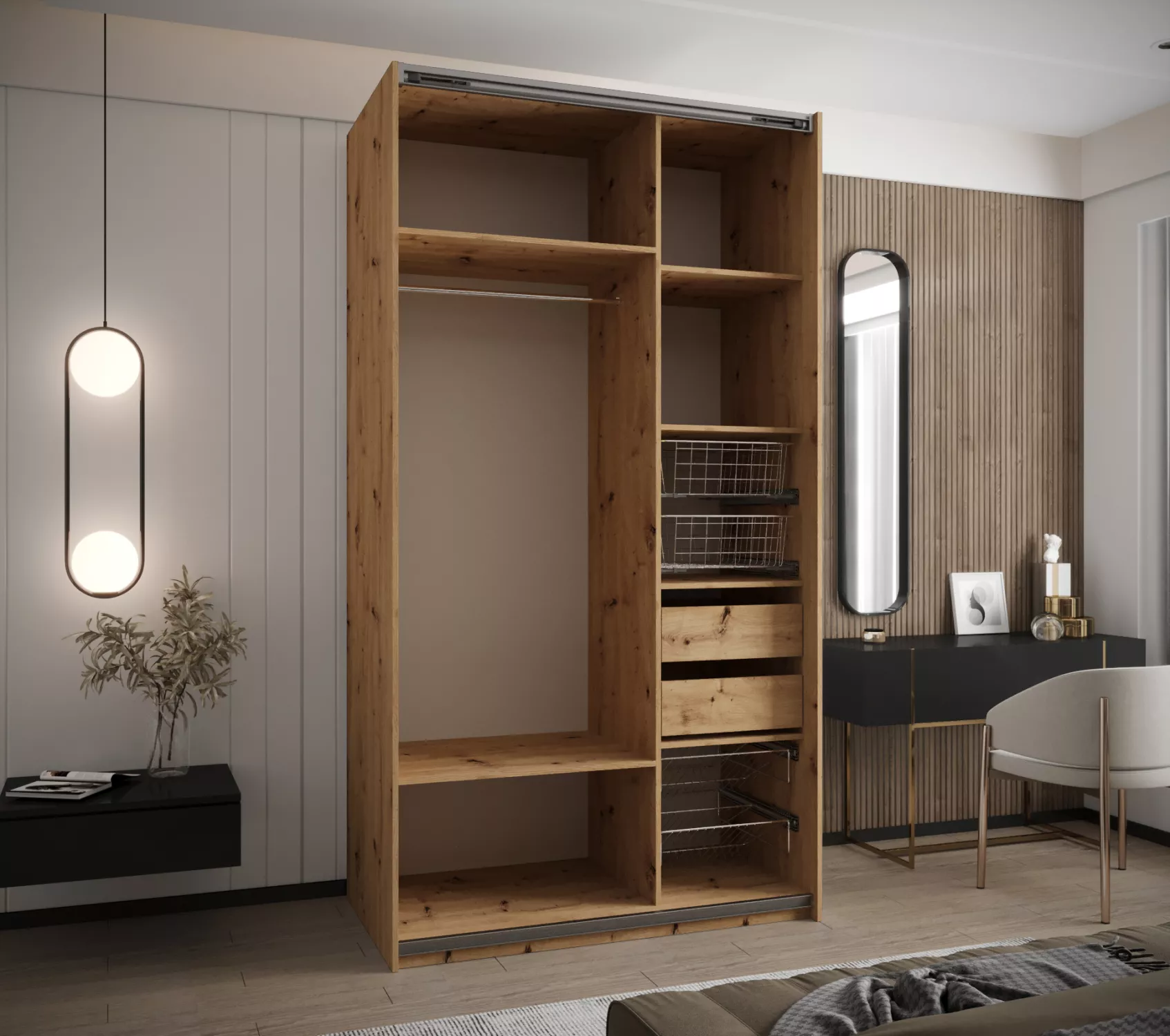 Prídavné police do skrine, šuplíky, drôtený košík a košík na topánky nájdete na dokúpenie v sekcii Odporúčame prikúpiť. Do skrine je možné nainštalovať 1 alebo 2 police a maximálne 4 sety šuplíkov.
