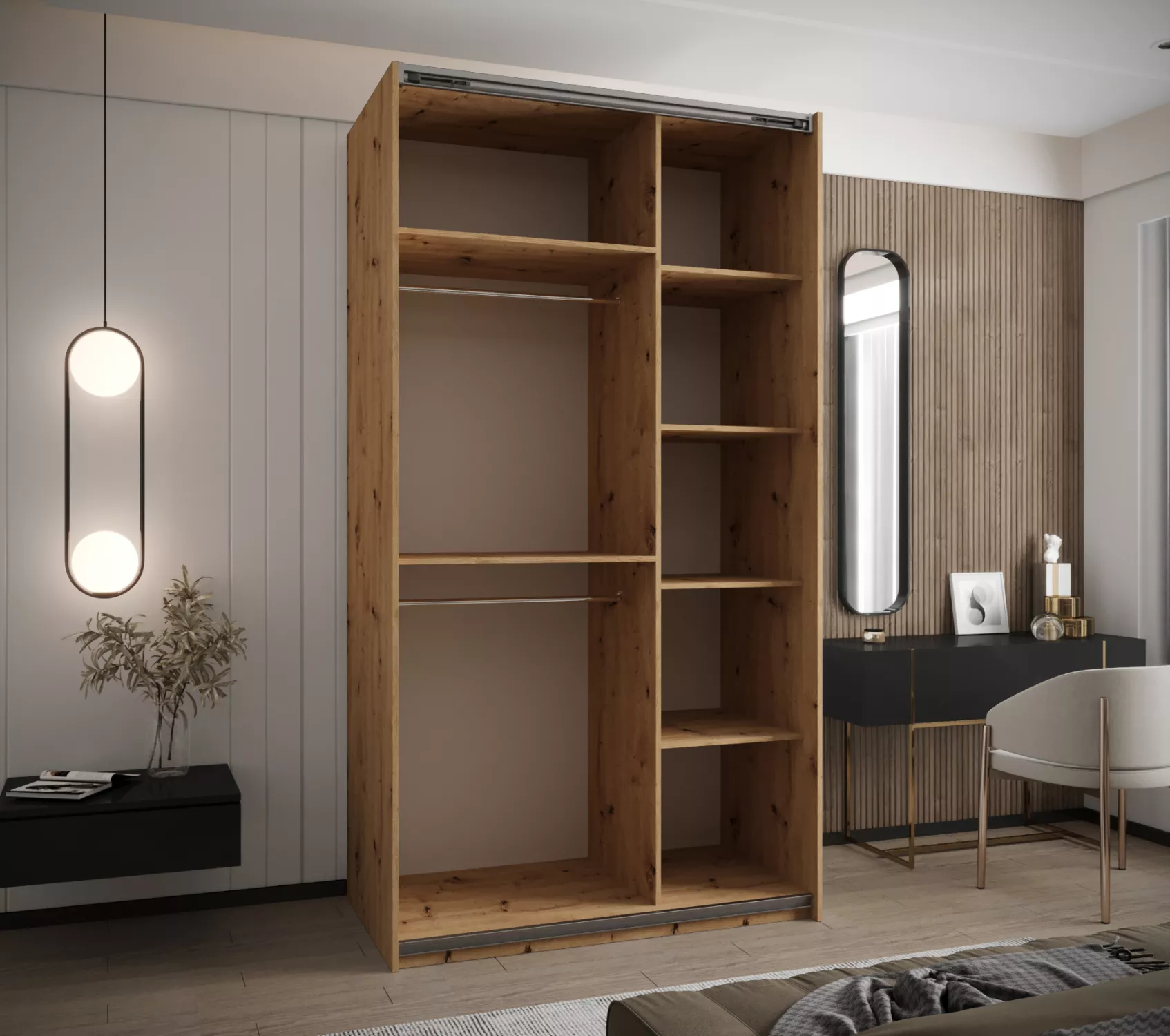 Dvojdverová skriňa SAMARA 4 predstavuje spojenie elegancie a funkčnosti. Ponúka dostatok úložného priestoru v podobe policového systému a 2 šatníkových tyčí.