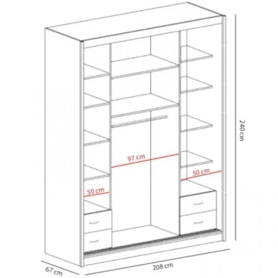 Šatníková skriňa s posuvnými dverami BERLINA sa hodí do každého moderného interiéru. Vnútro skrine ukrýva dlhú šatníkovú tyč, police a šuplíky.