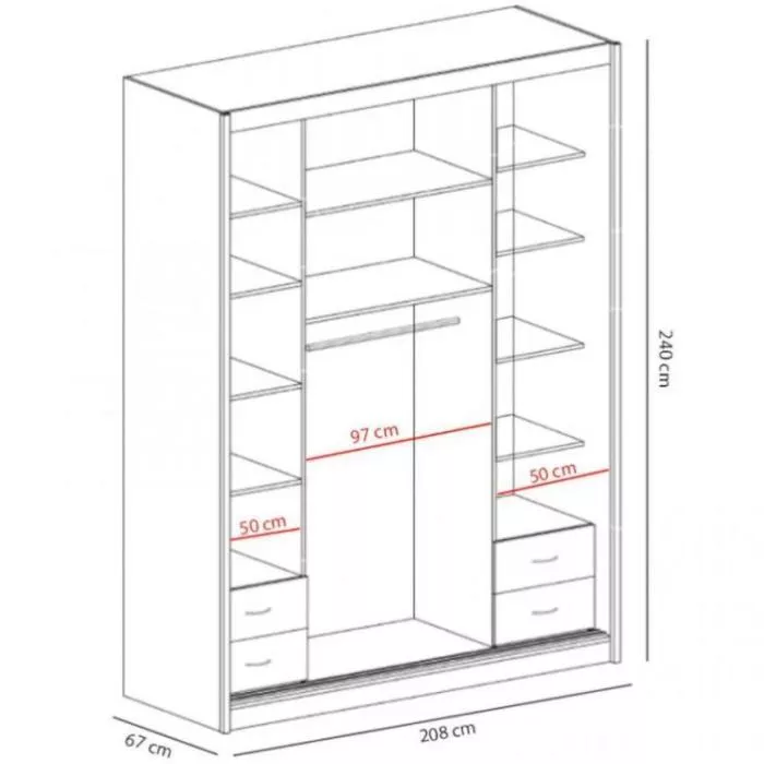Šatníková skriňa s posuvnými dverami so zrkadlom BERLINA sa hodí do každého moderného interiéru. Vnútro skrine ukrýva dlhú šatníkovú tyč, police a šuplíky. Zrkadlo opticky zväčší priestor.