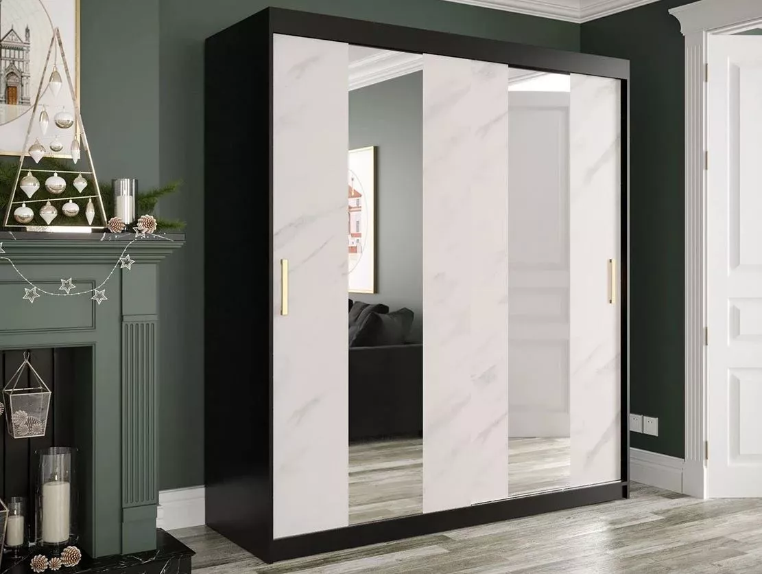 Zrkadlová šatníková skriňa 180 cm so zrkadlom a šuplíkmi CARSON 1 - biely mramor / čierna / zlatá