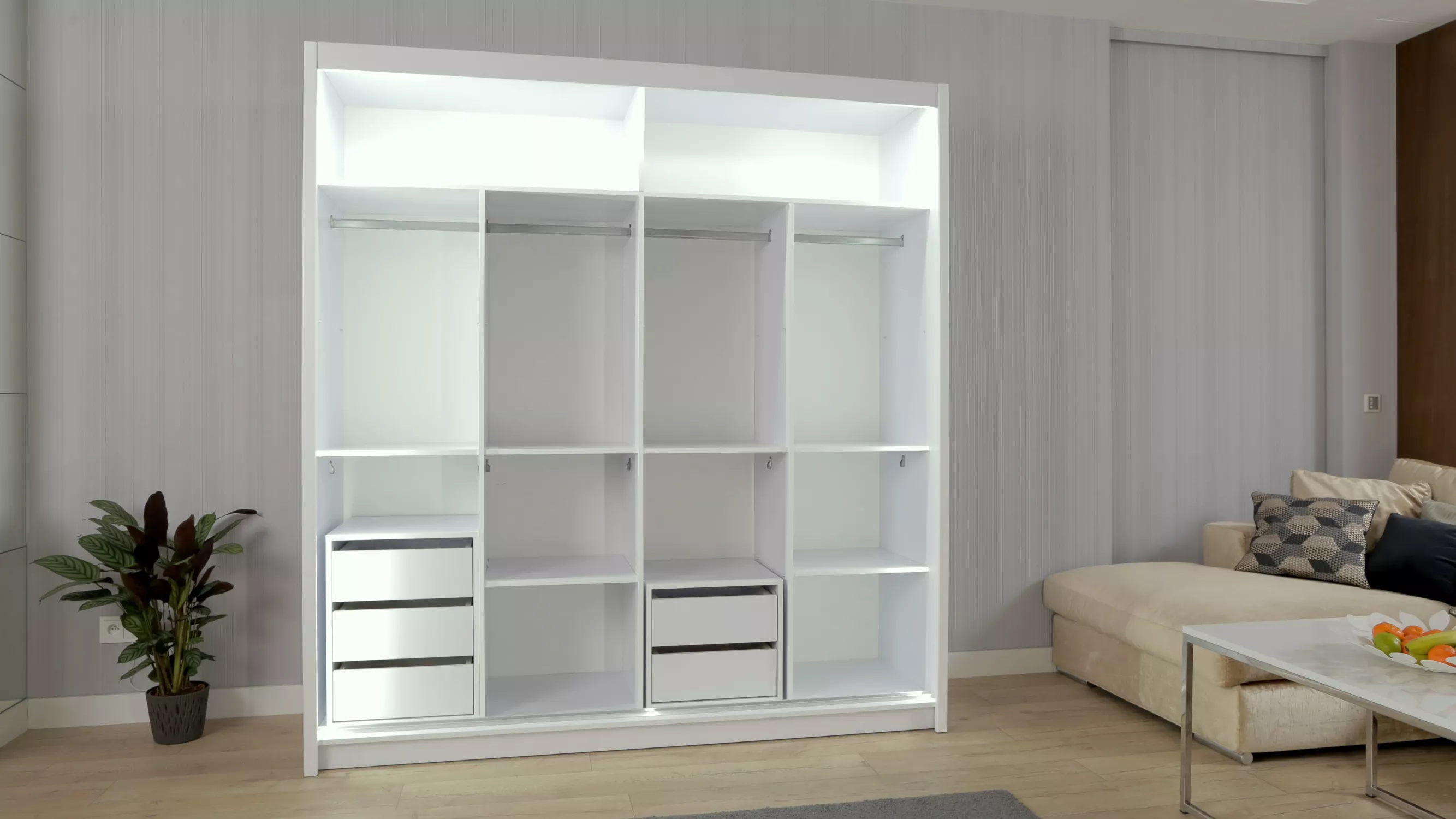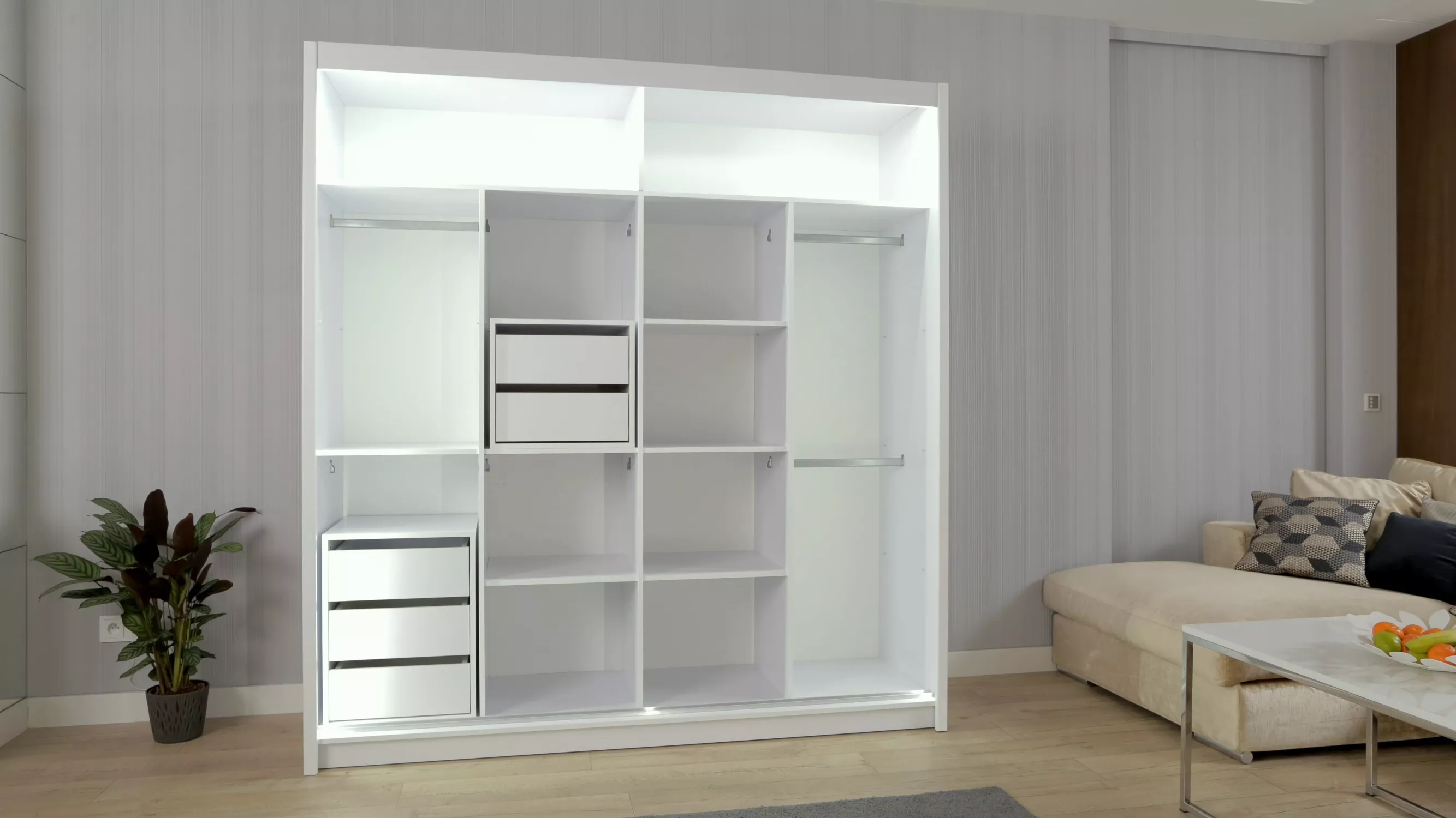 Zrkadlová šatníková skriňa KAILAN predstavuje spojenie elegancie a funkčnosti. Vnútorné usporiadanie skrine, ktoré je možné ľubovoľne meniť, vytvára dostatok úložného priestoru v podobe šatníkových tyčí a políc.