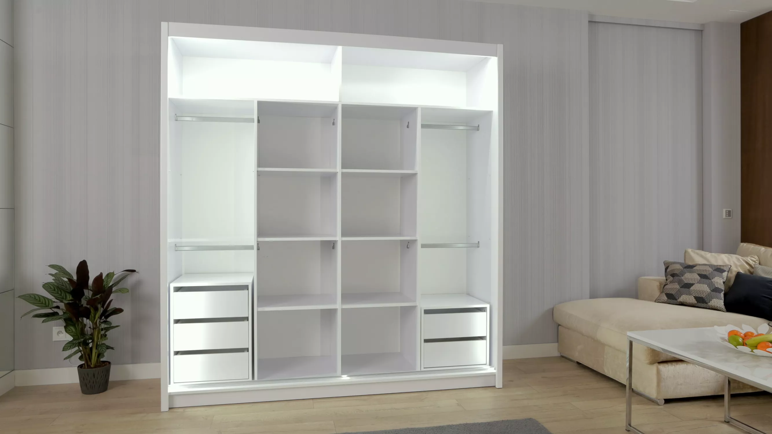 Zrkadlová šatníková skriňa KAILAN predstavuje spojenie elegancie a funkčnosti. Vnútorné usporiadanie skrine, ktoré je možné ľubovoľne meniť, vytvára dostatok úložného priestoru v podobe šatníkových tyčí a políc.