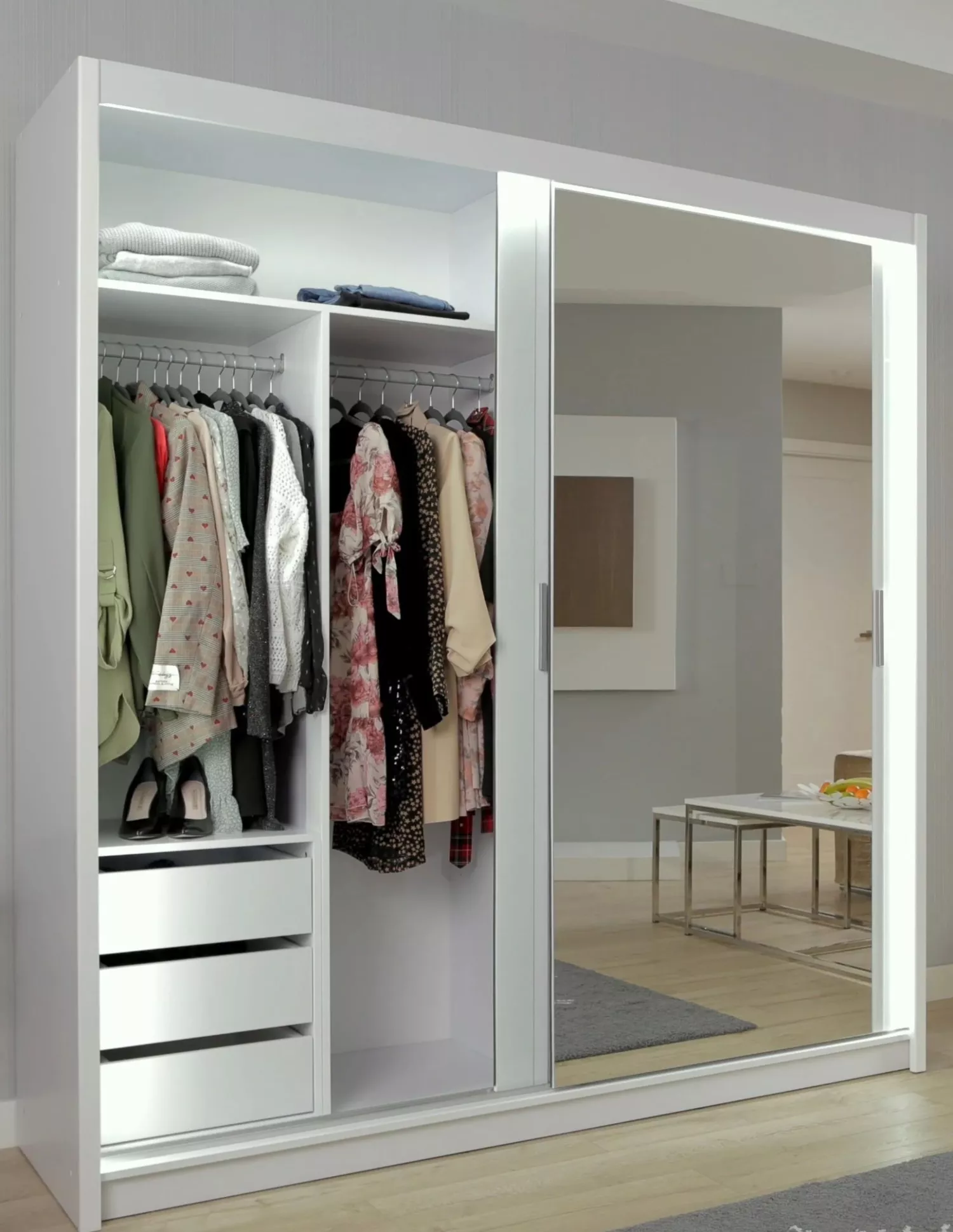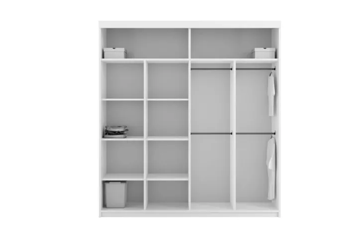 Zrkadlová šatníková skriňa KAILAN predstavuje spojenie elegancie a funkčnosti. Vnútorné usporiadanie skrine, ktoré je možné ľubovoľne meniť, vytvára dostatok úložného priestoru v podobe šatníkových tyčí a políc.