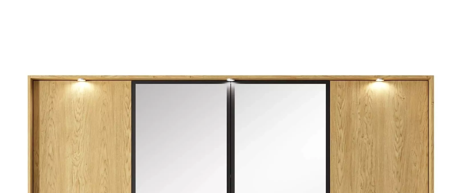 Veľká zrkadlová šatníková skriňa BRENT so šírkou 220 cm spája svetlý baltský dub s čiernymi detailmi do harmonického celku s moderným nádychom. Čierne drážkované čelá zásuviek, kovové nohy a úchytky podčiarkujú výrazný a nadčasový štýl celej kolekcie. Vnútri sa skrýva praktické usporiadanie - police po oboch stranách, šatníková tyč uprostred a šuplíky pre prehľadné uloženie všetkého potrebného.