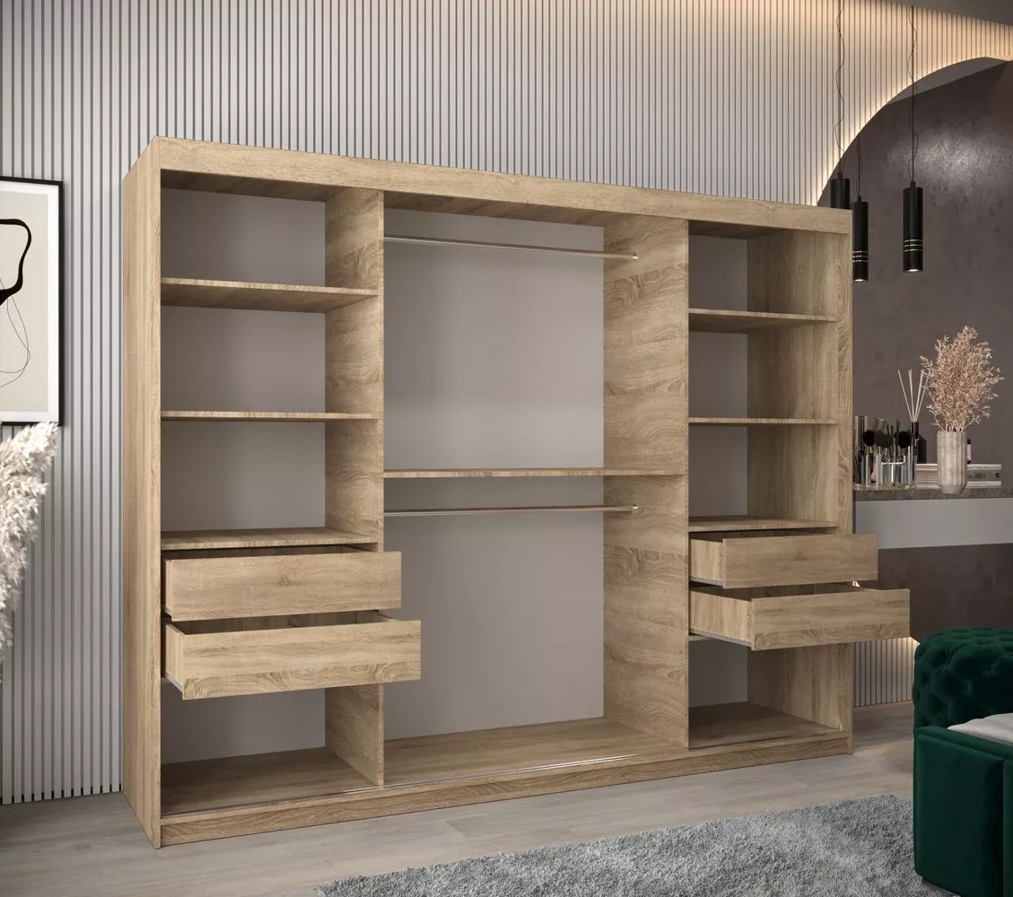 Šatníková skriňa so šírkou 250 cm vyrieši efektívne uskladnenie šatstva. Policové vnútorné usporiadanie poskytne prehľadné uloženie oblečenia a osobných vecí. Zrkadlo na dverách je elegantným aj praktickým prvkom.