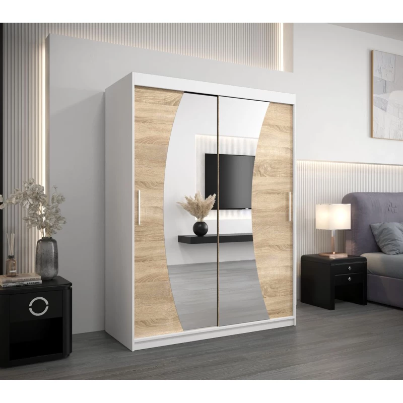 Krásna šatníková skriňa so zrkadlami a posuvnými dverami Anabela 150 vo farbe biela - dub sonoma
