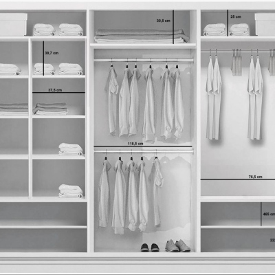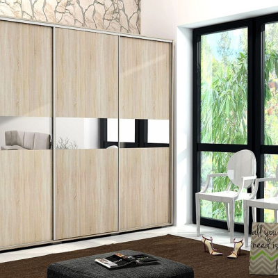 Moderná šatníková skriňa, ktorá sa so svojím minimalistickým dizajnom hodí do všetkých typov interiérov. Korpus skrine je vyrobený z veľmi kvalitnej laminovanej dosky. Za tromi posuvnými dverami sa ukrýva veľa úložného priestoru, do ktorého sa hravo zmestí všetko oblečenie. Vnútorná časť je systematicky usporiadaná do praktických menších oddielov. Po ruke budete mať nielen veľa políc, ale aj tri šatníkové tyče, na ktoré si môžete zavesiť vešiaky s oblečením. V strednej časti sa nachádza veľké zrkadlo, ktoré dodáva skrini luxusnejší vzhľad. Skriňa nemá žiadne výrazné úchytky, dvere sa otvárajú pomocou kovových líšt umiestnených po bokoch.