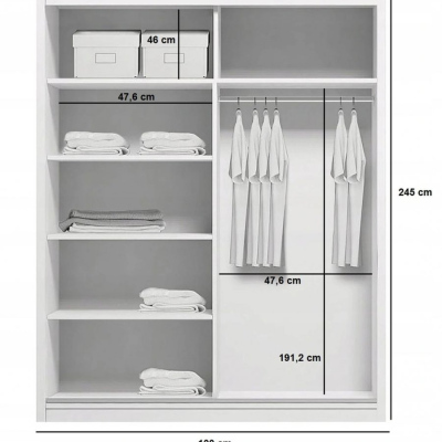 Šatníková skriňa Jacobo predstavuje kvalitný doplnok do modernej spálne alebo predsiene. Okrem jedinečného dizajnu ponúka veľa miesta na uloženie oblečenia. Skriňa disponuje posuvnými dverami na kvalitných hliníkových vodiacich lištách, otváranie dverí je tak hladké a plynulé. Skriňa nemá žiadne výrazné úchytky, dvere sa otvárajú pomocou líšt na bokoch. Vo vnútri skrine sú police a šatníková tyč.