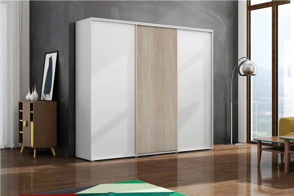 Moderná šatníková skriňa, ktorá sa so svojím minimalistickým dizajnom hodí do všetkých typov interiérov. Korpus skrine je vyrobený z veľmi kvalitnej laminovanej dosky, okraje sú spevnené ABS hranami. Za tromi posuvnými dverami sa ukrýva veľa úložného priestoru, do ktorého sa zmestí všetko oblečenie. Vnútorná časť je systematicky usporiadaná do menších praktických oddielov. Poruke budete mať nielen množstvo políc, ale aj tri šatníkové tyče, na ktoré si môžete zavesiť vešiaky s oblečením. Skriňa nemá žiadne výrazné úchytky, dvere sa otvárajú pomocou líšt na bokoch. Vo vnútri skrine sú police a šatníkové tyče.