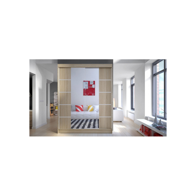 Konštrukcia skrine je vyrobená z vysoko kvalitnej laminovanej dosky, ktorej hrany boli zosilnené PVC dyhou, čo zaručuje vysokú kvalitu. Systém posuvných dverí funguje hladko a plynulo. Hliníkové kľučky na posuvných dverách zdôrazňujú moderný štýl, zvyšujú funkčnosť šatníka a bránia ohýbaniu dverí.