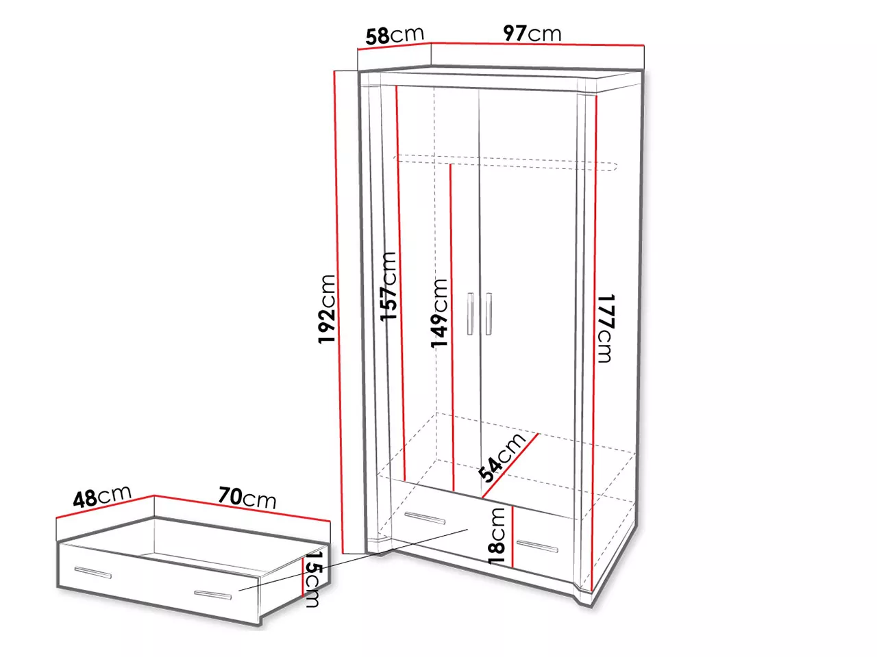 Šatníková skriňa ARIKA môže byť doplnkom každej spálne alebo predsiene. Skriňa je vybavená tyčou na ramienka a zásuvkou, ktorá je umiestnená v spodnej časti. Kvalitné komponenty, najmä laminovaná doska, zaisťujú stabilitu a životnosť skrinky.