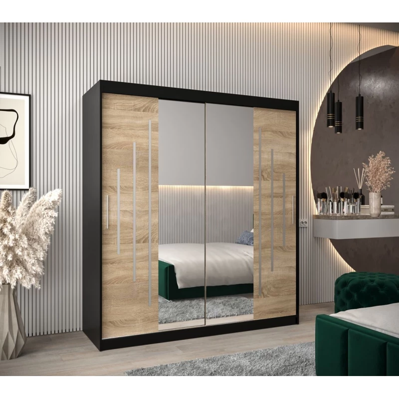 Šatníková skriňa so zrkadlom EWELINA - šírka 180 cm, čierna / dub sonoma
