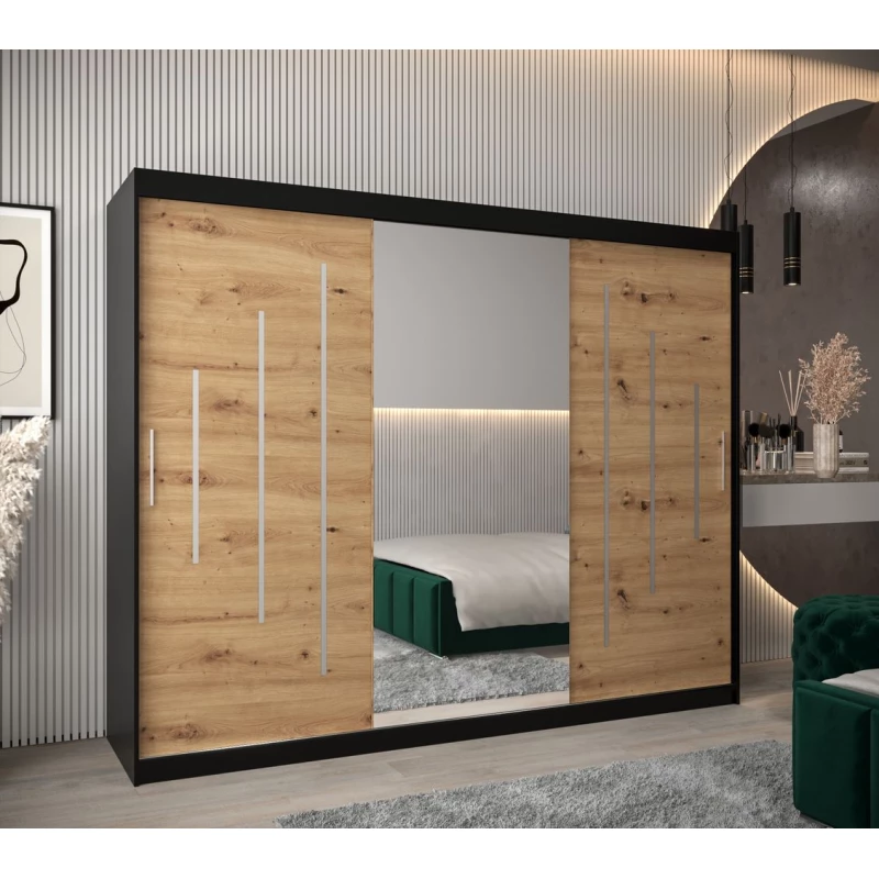 Šatníková skriňa so zrkadlom ANNA - šírka 250 cm, čierna / dub artisan