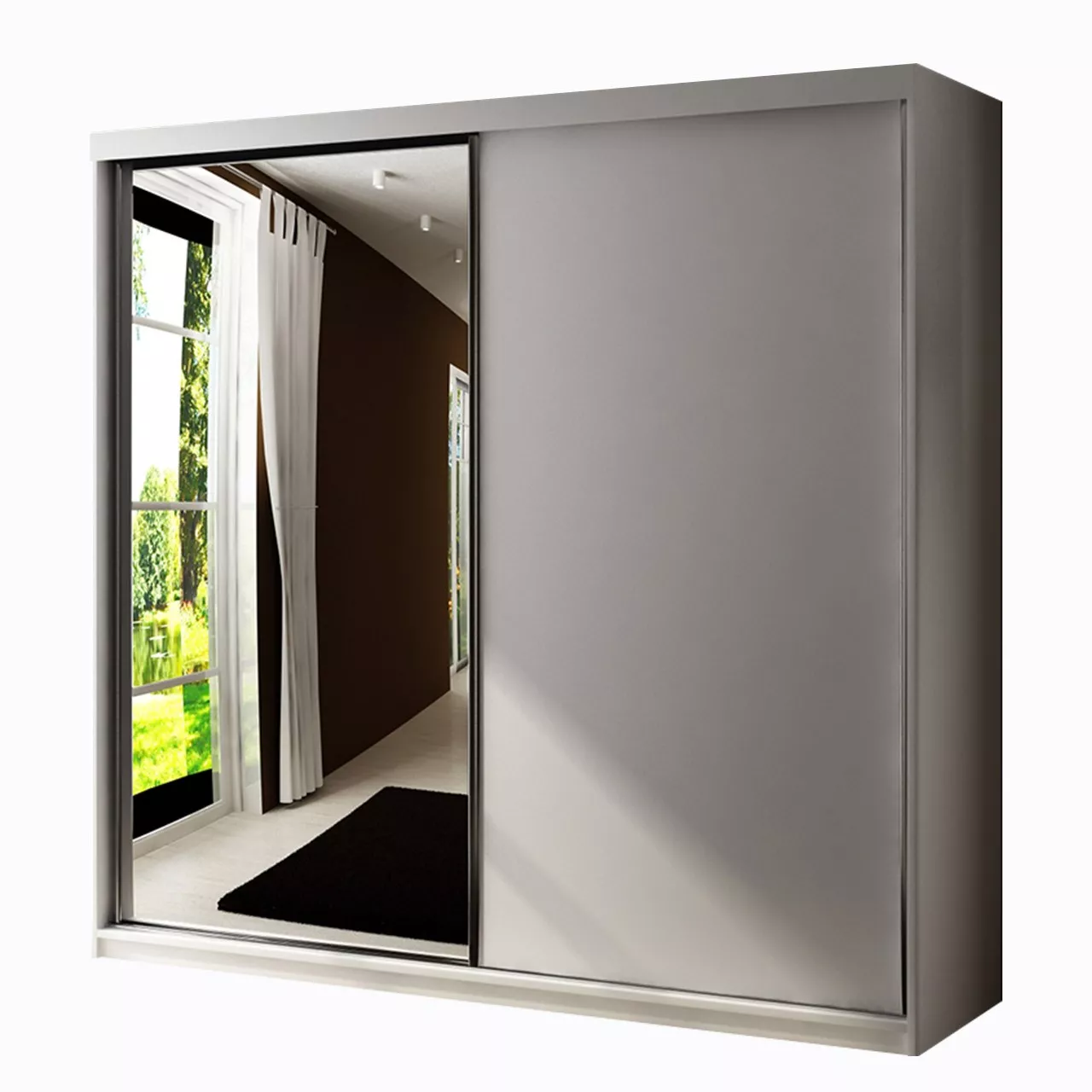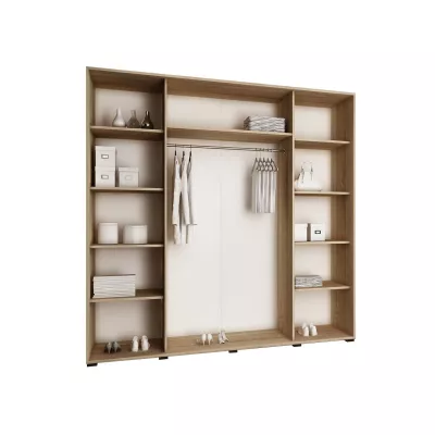 Šatníková skriňa ELVIRA 5 so šírkou 200 cm ponúka dostatok úložného priestoru. V strednej časti skrine s posuvnými dverami sa nachádza tyč na zavesenie oblečenia. Úložné zóny umiestnené po stranách sú zase vybavené hlbokými policami. Skriňa je navyše doplnená o praktické zrkadlo a inovatívne modré LED osvetlenie.