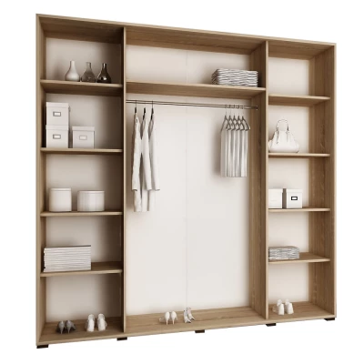 Šatníková skriňa ELVIRA 6 so šírkou 200 cm ponúka dostatok úložného priestoru. V strednej časti skrine s posuvnými dverami sa nachádza tyč na zavesenie oblečenia. Úložné zóny umiestnené po stranách sú zase vybavené hlbokými policami. Skriňa je navyše doplnená o inovatívne RGB LED osvetlenie.