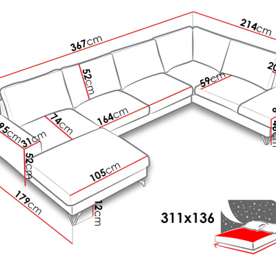 Jednoduchým rozložením získate spaciu plochu s rozmermi 136x311 cm. V sedacej súprave sa nachádzajú dva praktické úložné priestory na posteľnú bielizeň, ktoré môžu napríklad slúžiť ako miesto na úschovu sezónneho oblečenia.
