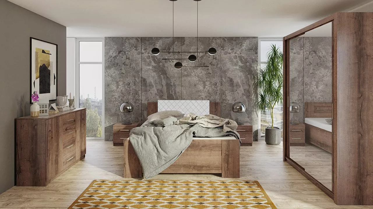 Nábytok do spálne CORTLAND 2 je funkčná zostava vytvorená pre štýlové a praktické spálne a obytné miestnosti. Je zachovaná v jednoduchom a modernom dizajne a univerzálnych farbách. Spálňa je vyrobená z pevných materiálov, ktoré zabezpečia, že nábytok bude dlhé roky vyzerať ako nový. Prvým prvkom zostavy je kombinovaná komoda, ktorá je vybavená skrinkami s policami a množstvom priestranných zásuviek. Šatníková skriňa s posuvnými dverami disponuje hlbokými policami a samostatnou vešiakovou zónou vybavenou šatníkovými tyčami na vešiaky. Zrkadlo je praktickým doplnkom, aby ste si mohli skontrolovať svoj outfit. Ďalším prvkom sú dva nočné stolíky, ktoré sú vybavené praktickými zásuvkami na úschovu rôznych doplnkov. Posledným a nevyhnutným prvkom zostavy je manželská posteľ s ložnou plochou na spanie 160x200 cm. Optimálna výška postele 90 cm uľahčuje vstávanie z postele a zabezpečuje dostatočné vetranie matraca. Vďaka vysokej čalúnenej opierke hlavy získate mäkké a pohodlné operadlo pri večernom odpočinku s knihou. Posteľ je vybavená úložným priestorom na posteľnú bielizeň alebo sezónne oblečenie.